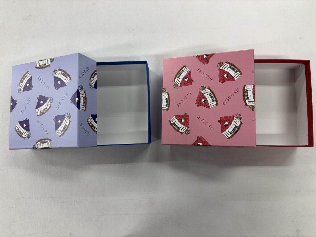 今回製造した貼り箱はフタにはシュシュクル様の文字とお店のロゴでもあるお家のマークが入っています。赤と青で目を引くパッケージとなっており、是非世田谷のお店に立ち寄った際にはお手に取ってみていただきたいです。