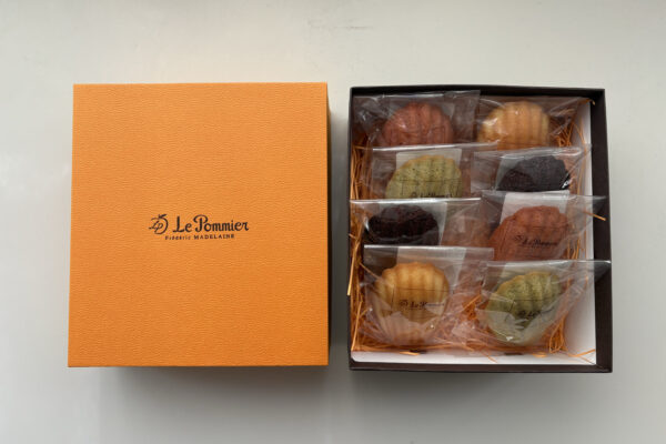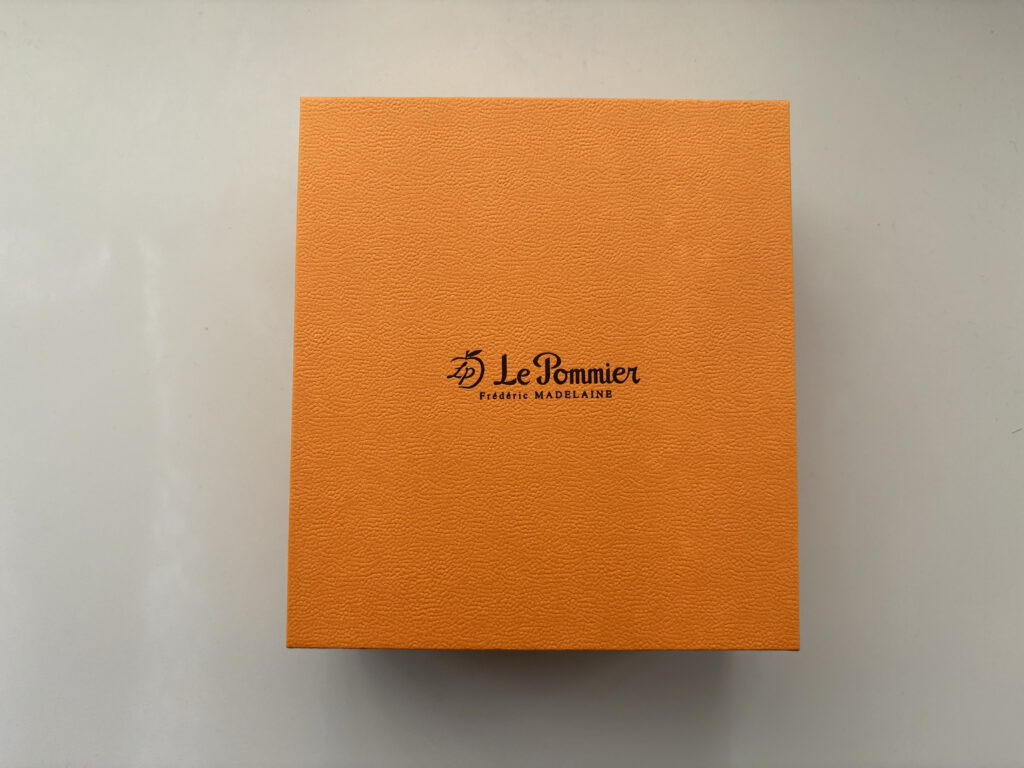 鮮やかなオレンジが印象的なル・ポミエ様の貼り箱オリジナルは、ブランドの世界観をそのまま表現した一箱です。質感のある素材にロゴをシンプルに配置することで、上質なパッケージとしての存在感を高めています。色と質感だけで印象をつくる設計は、ギフト需要の高い洋菓子において非常に効果的です。